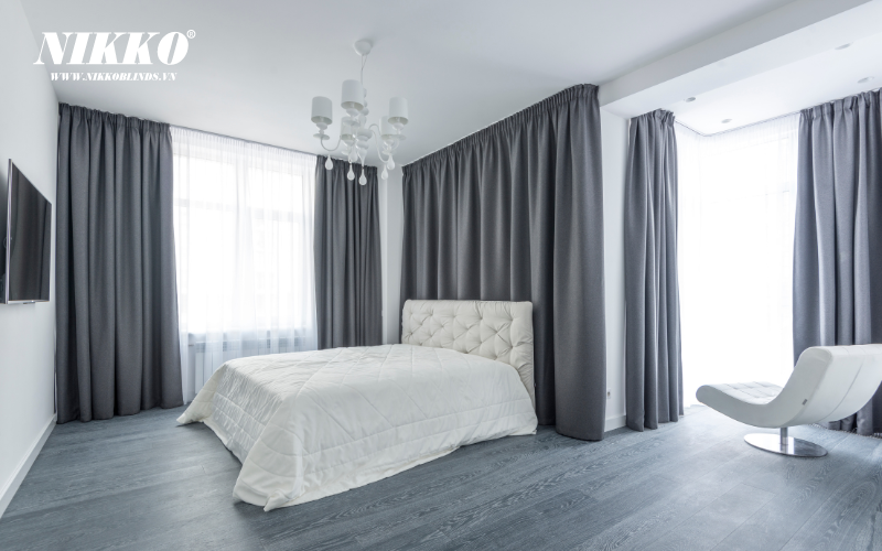 Rèm cửa màu xám là lựa chọn hoàn hảo khi kết hợp với tường trắng, tạo ra sự tương phản đẹp mắt và hiện đại. Màu xám có thể làm nổi bật không gian trắng trong nhà mà không gây ra sự quá tải.